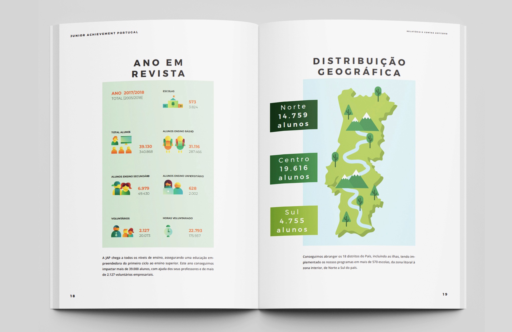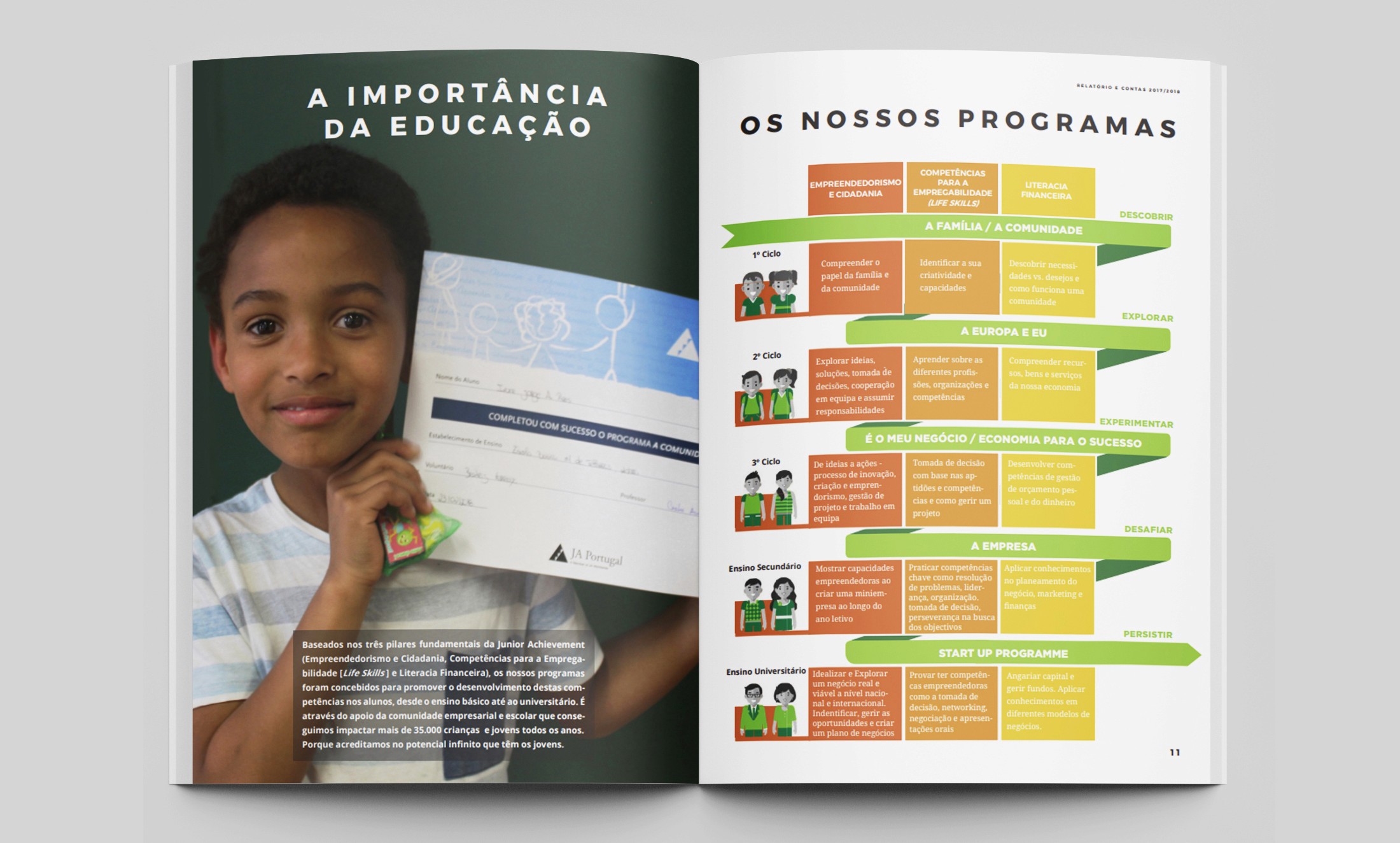 My design transformed the annual report into an engaging, informative document that effectively communicates Junior Achievement Portugal's mission and impact.